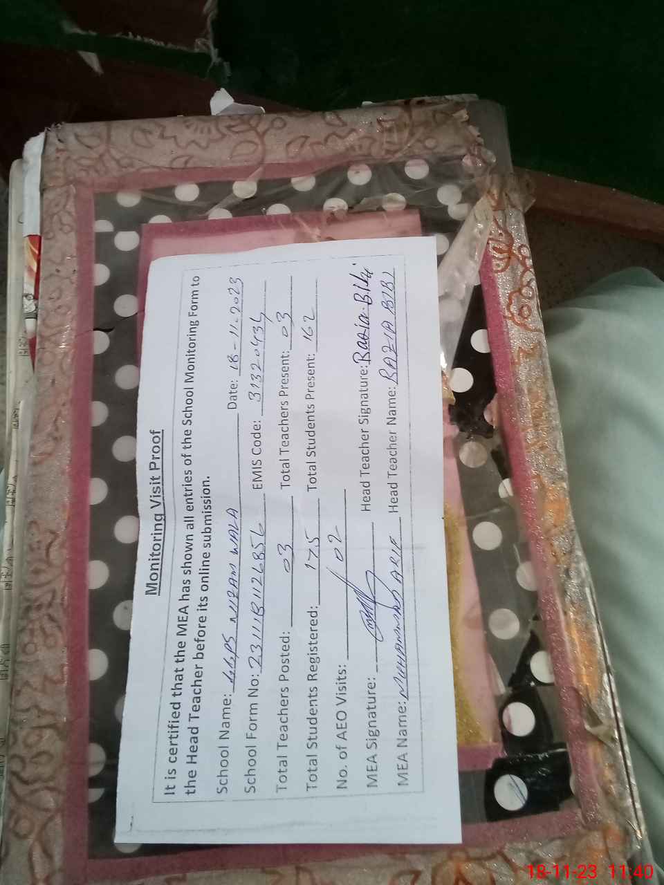 | Attendance Register | Head Teacher | MEA with School | Visit Proof |