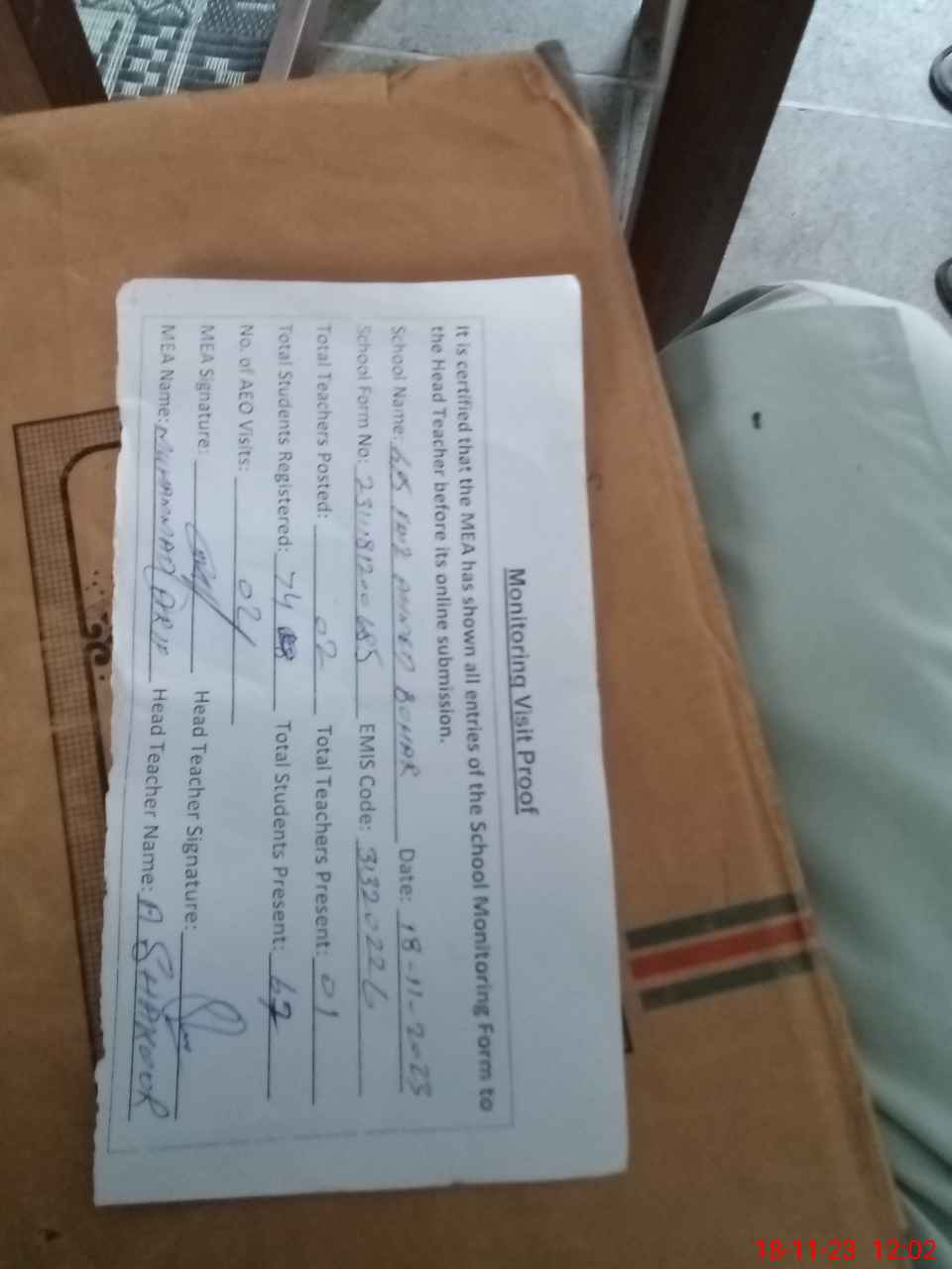 | Attendance Register | Head Teacher | MEA with School | Visit Proof |