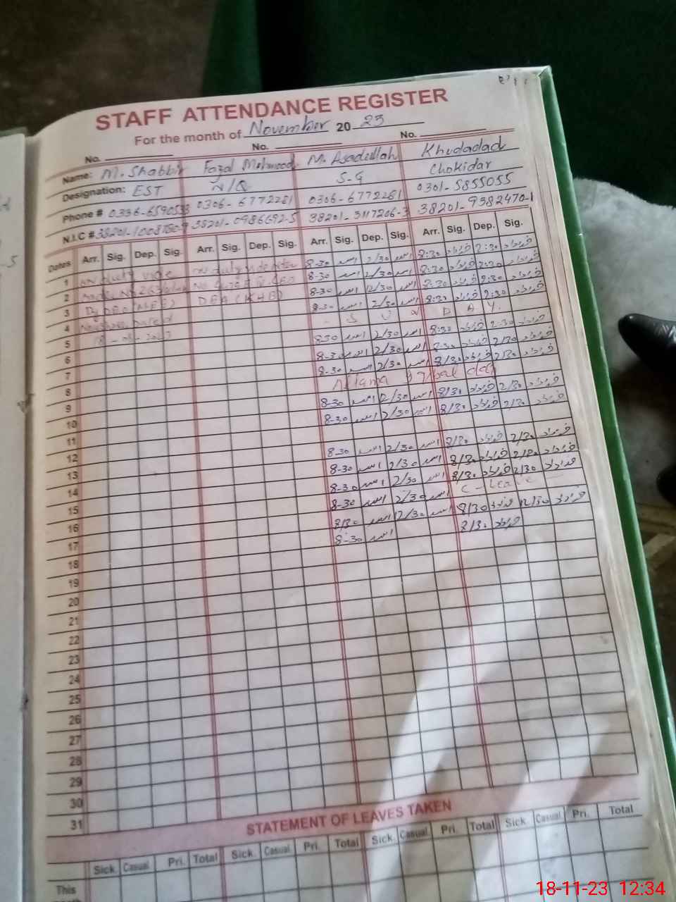 | CNIC | Full Name | Designation | R/C | Absence During Last Calender Month |