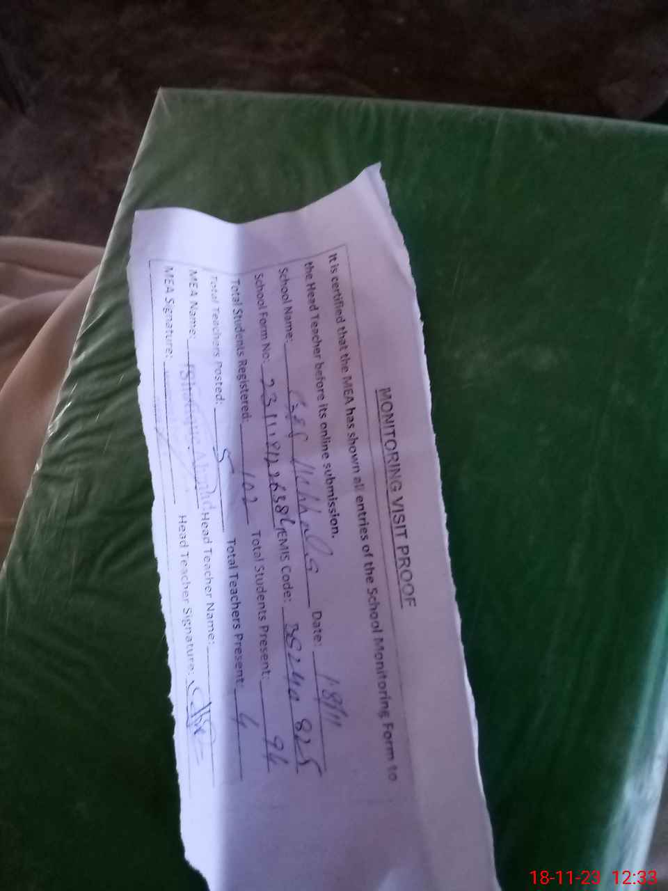 | Attendance Register | Head Teacher | MEA with School | Visit Proof |