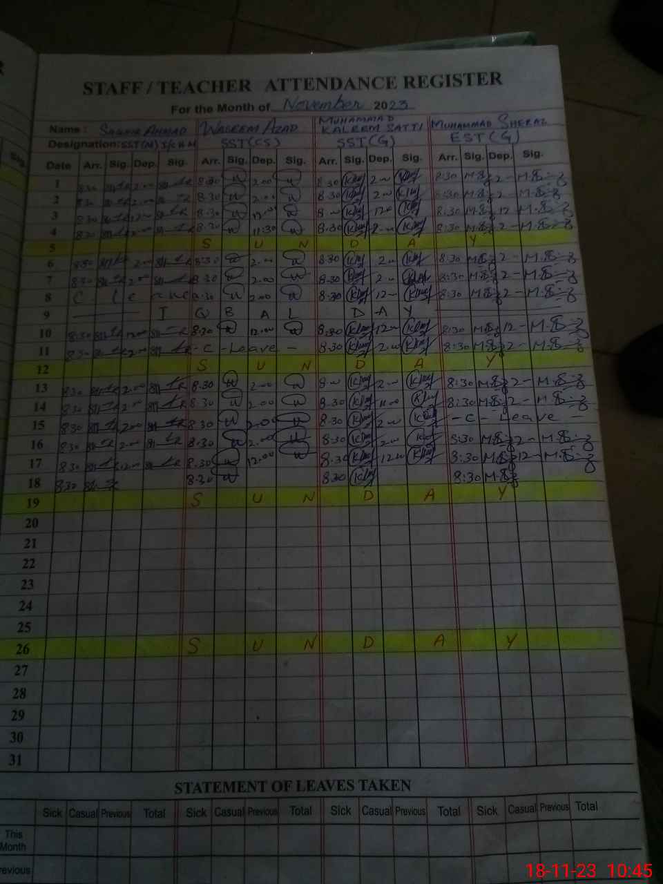 | CNIC | Full Name | Designation | R/C | Absence During Last Calender Month |