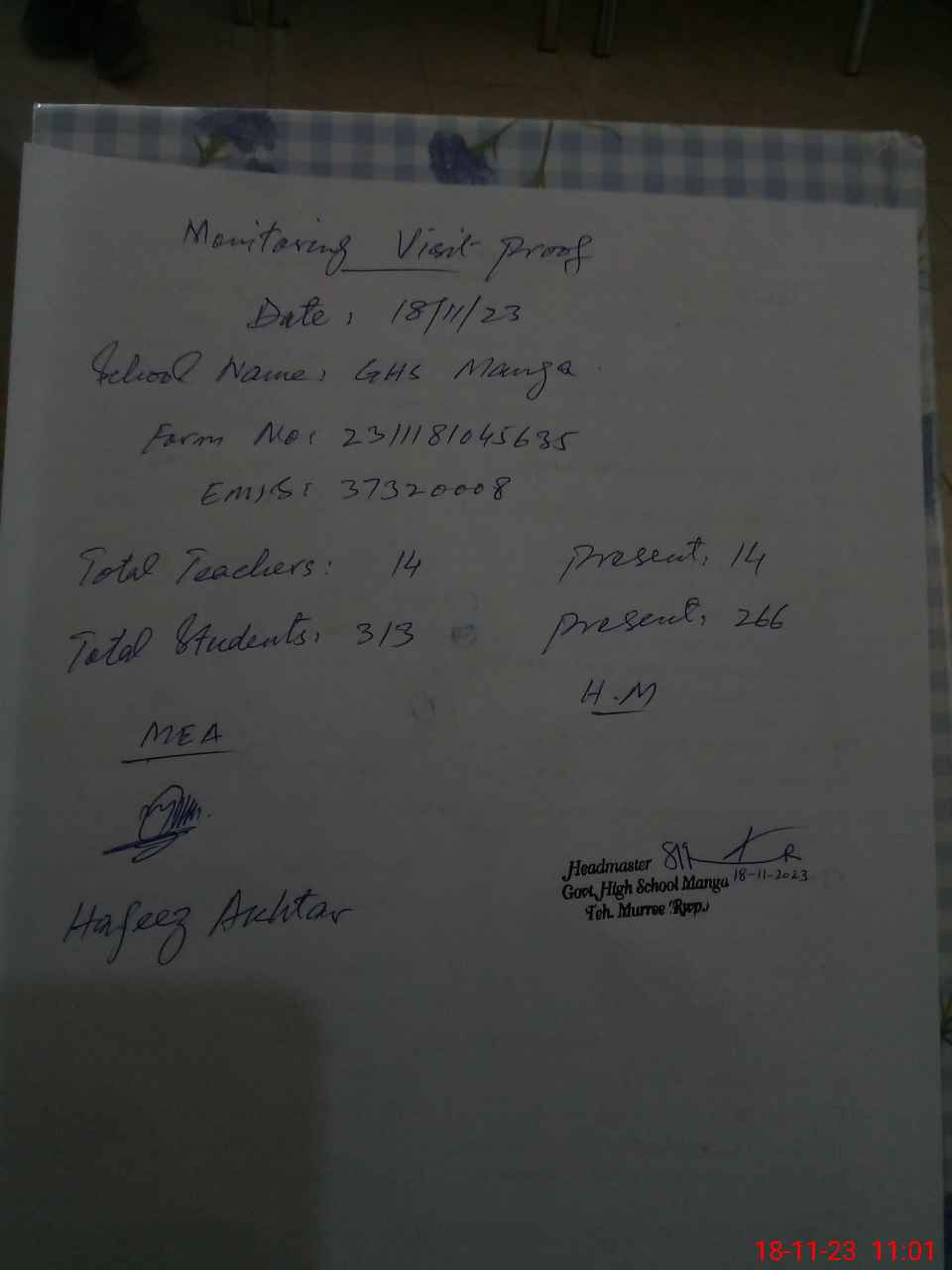 | Attendance Register | Head Teacher | MEA with School | Visit Proof |