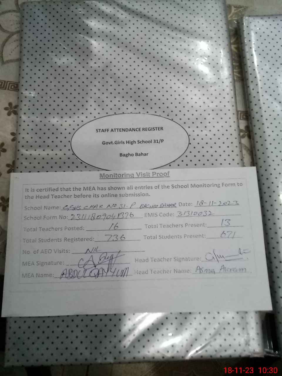 | EMIS Code: 31310032 | Name of School: GGHS CHAK NO. 31/P BAGHO BAHAR | |||