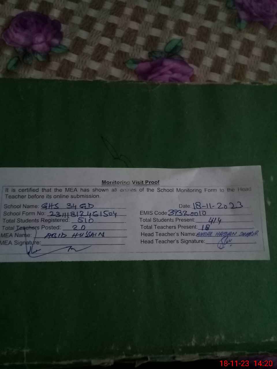 | Attendance Register | Head Teacher | MEA with School | Visit Proof |