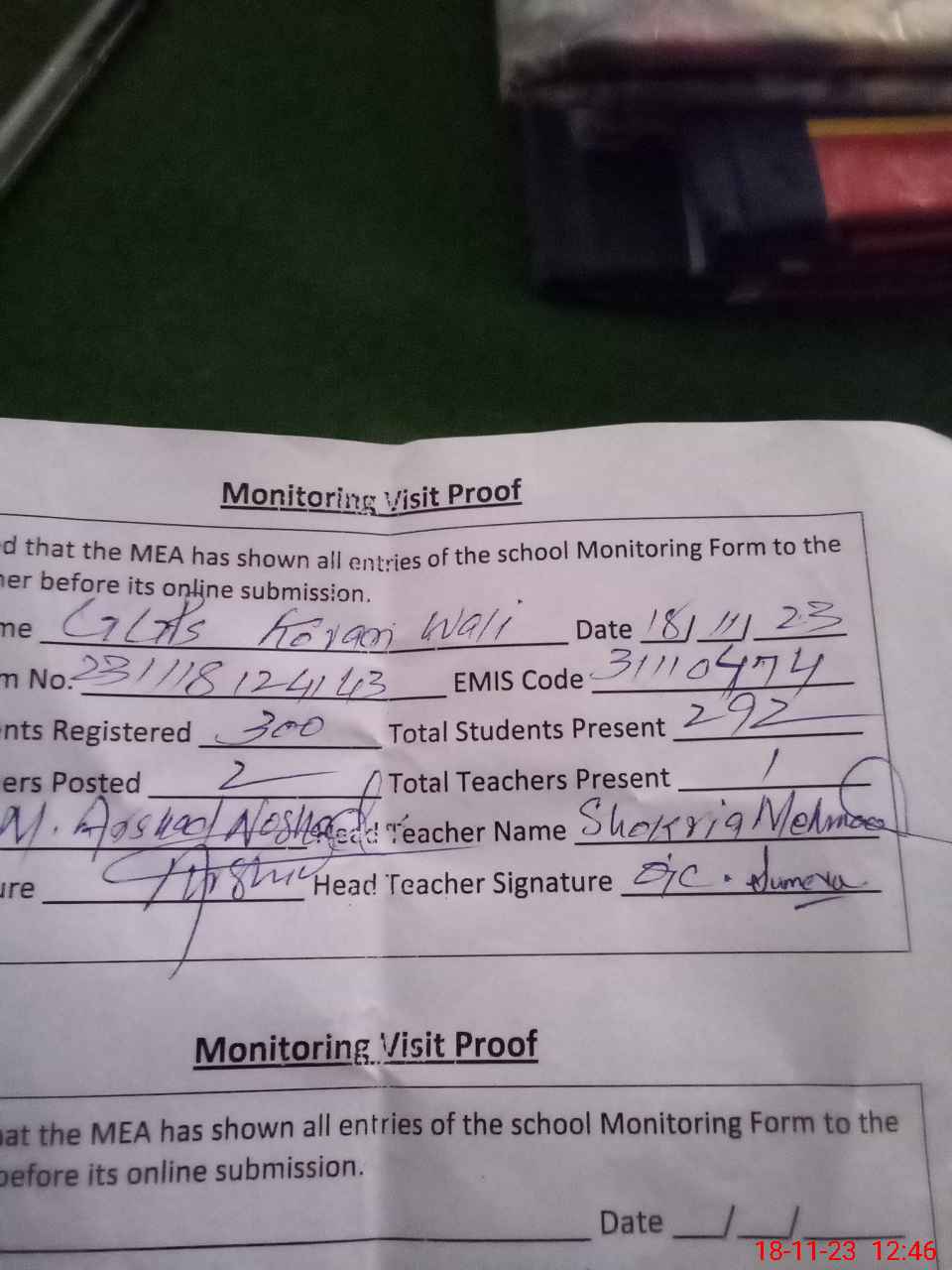 | Attendance Register | Head Teacher | MEA with School | Visit Proof |