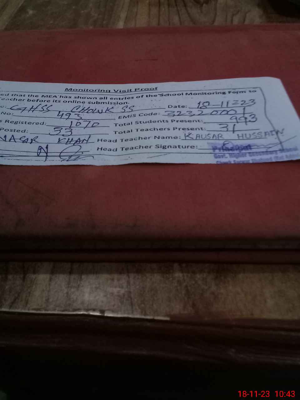 | Attendance Register | Head Teacher | MEA with School | Visit Proof |