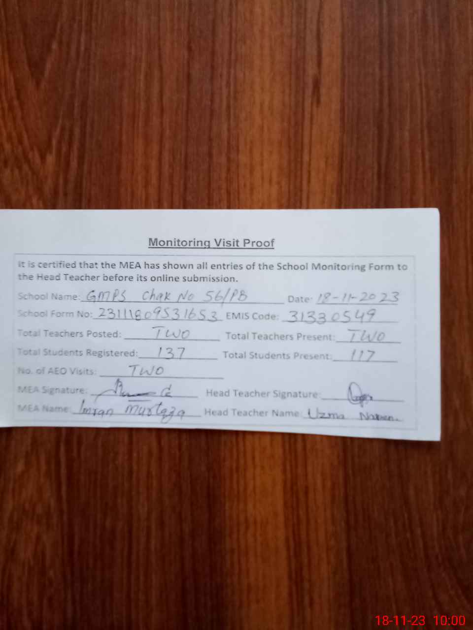 | Attendance Register | Head Teacher | MEA with School | Visit Proof |