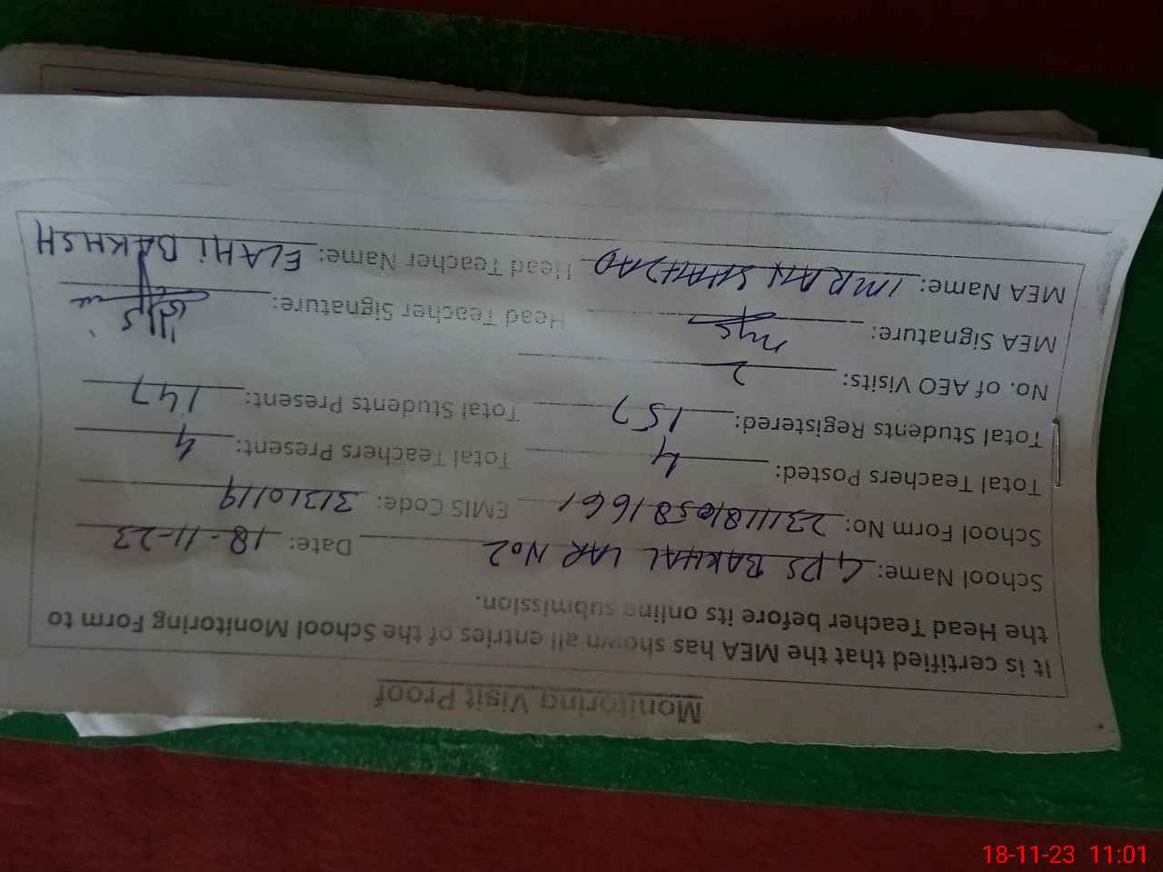 | Attendance Register | Head Teacher | MEA with School | Visit Proof |