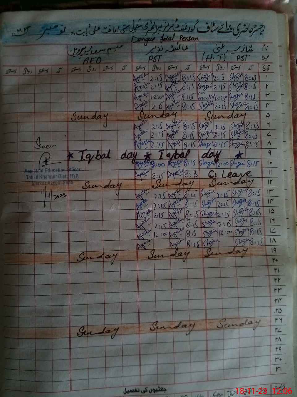 | CNIC | Full Name | Designation | R/C | Absence During Last Calender Month |