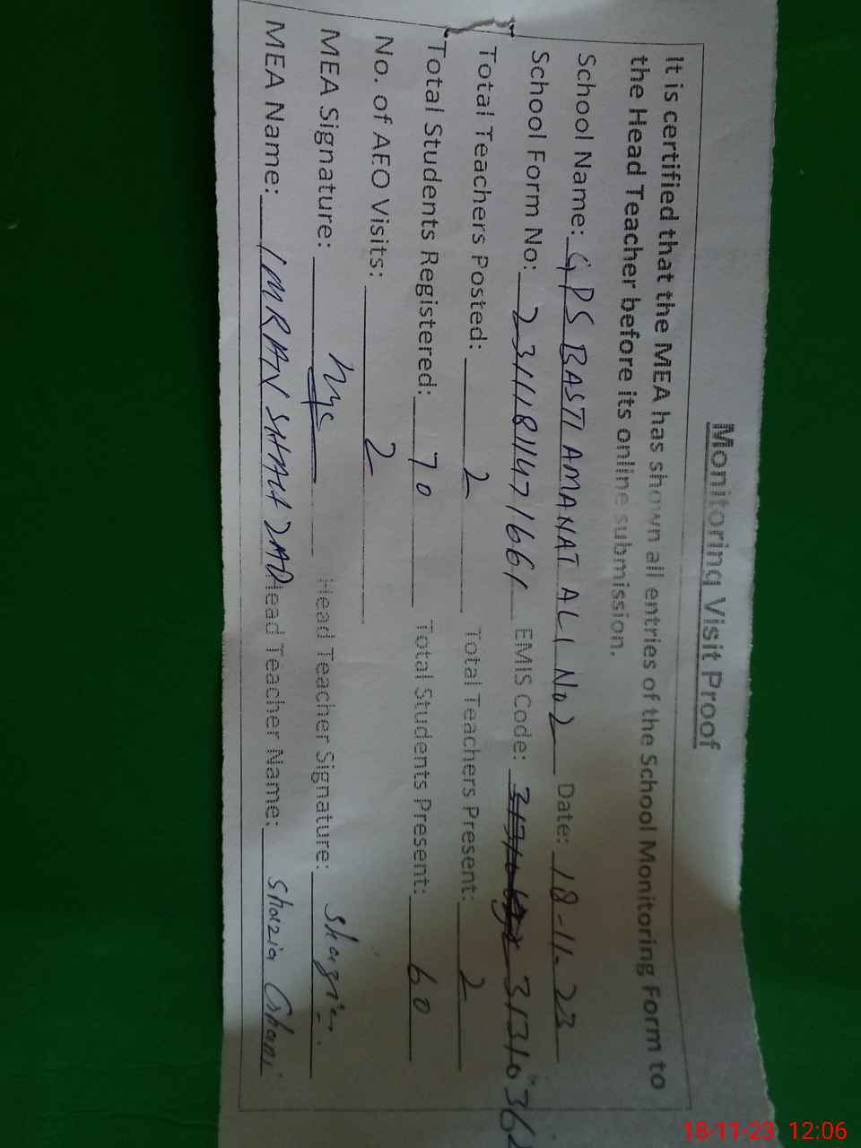 | Attendance Register | Head Teacher | MEA with School | Visit Proof |