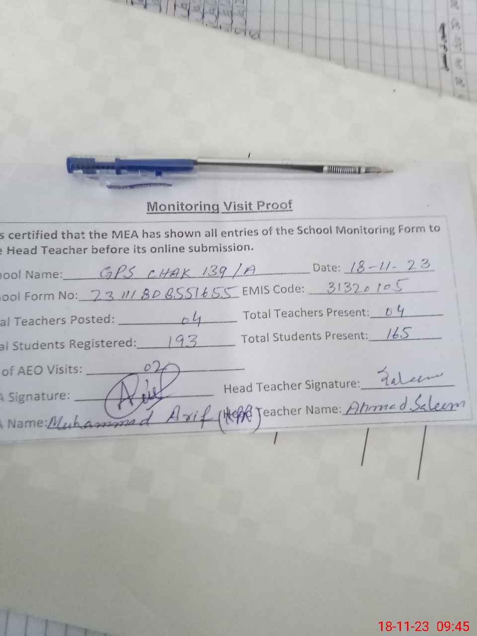 | Attendance Register | Head Teacher | MEA with School | Visit Proof |