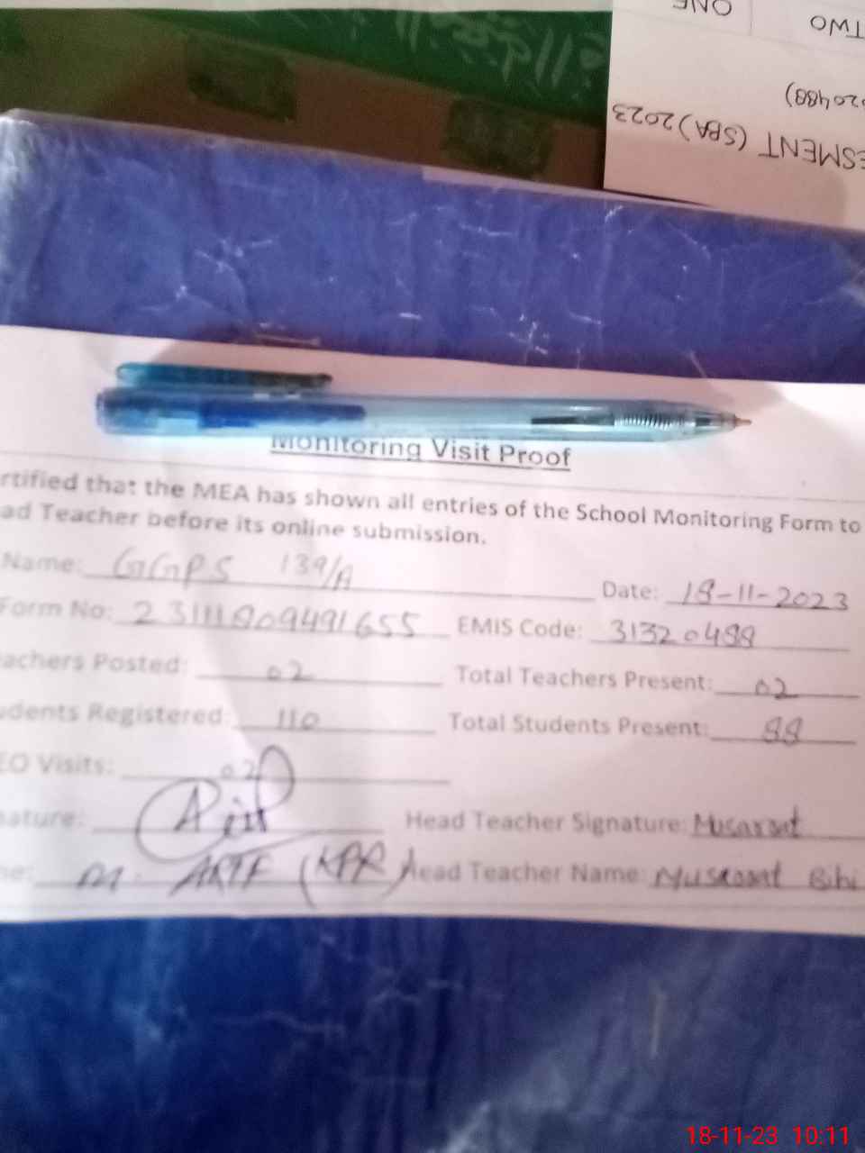 | Attendance Register | Head Teacher | MEA with School | Visit Proof |