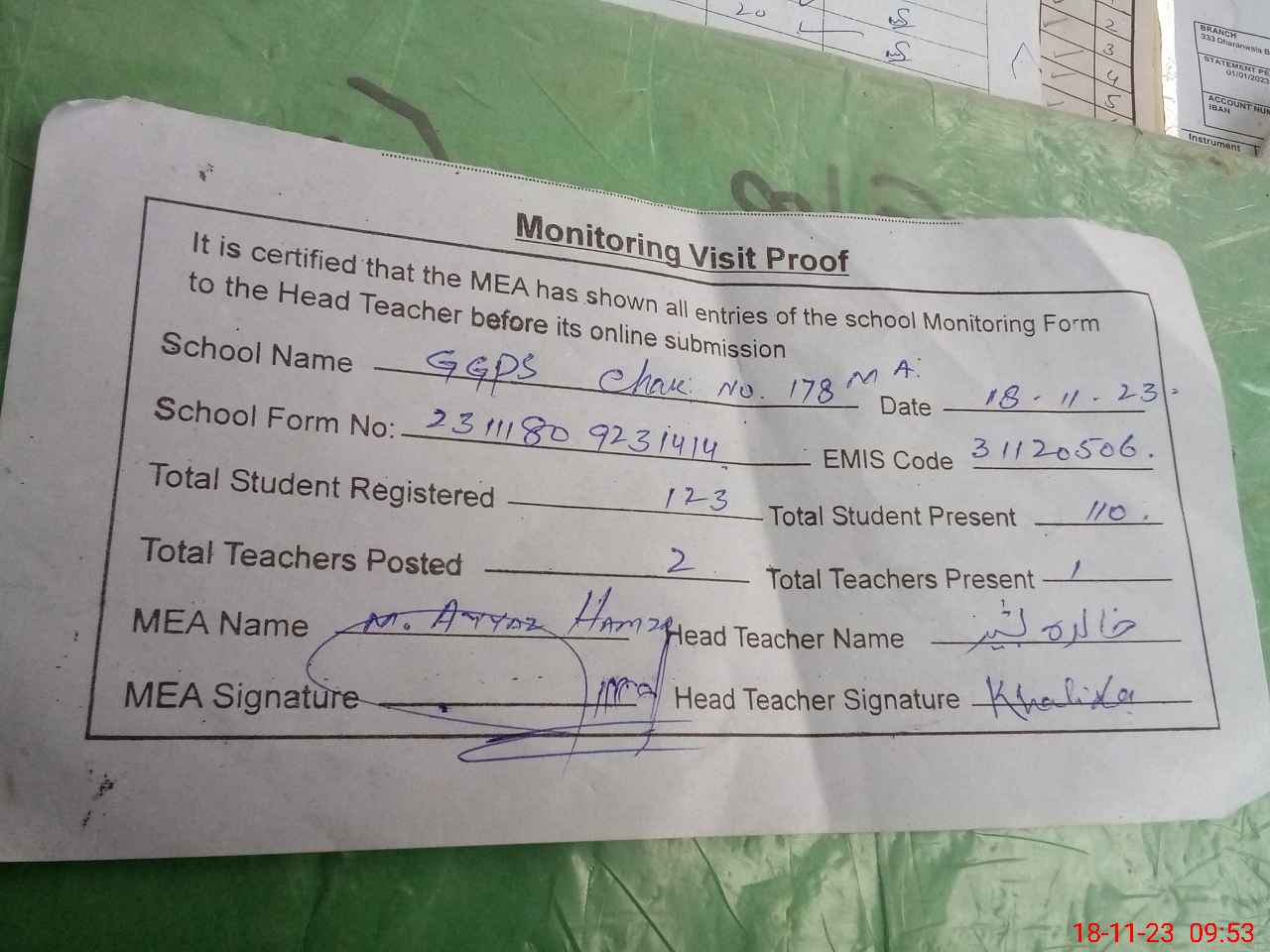 | Attendance Register | Head Teacher | MEA with School | Visit Proof |