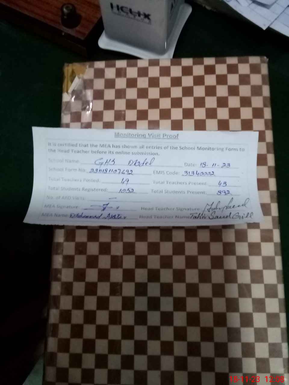 | Attendance Register | Head Teacher | MEA with School | Visit Proof |