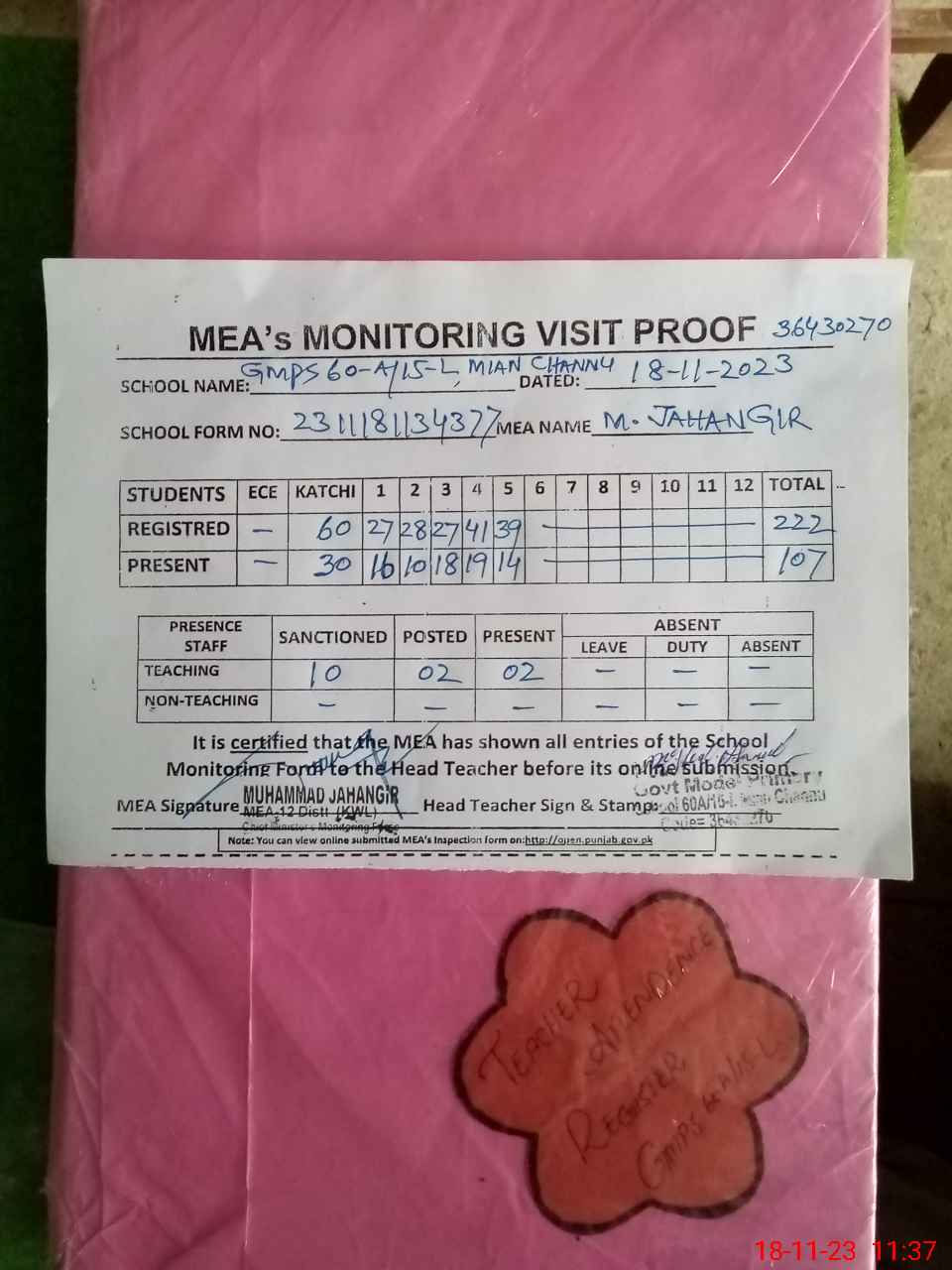 | Attendance Register | Head Teacher | MEA with School | Visit Proof |