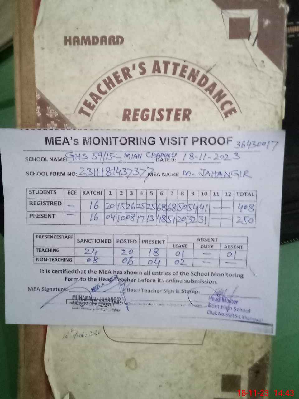 | Attendance Register | Head Teacher | MEA with School | Visit Proof |