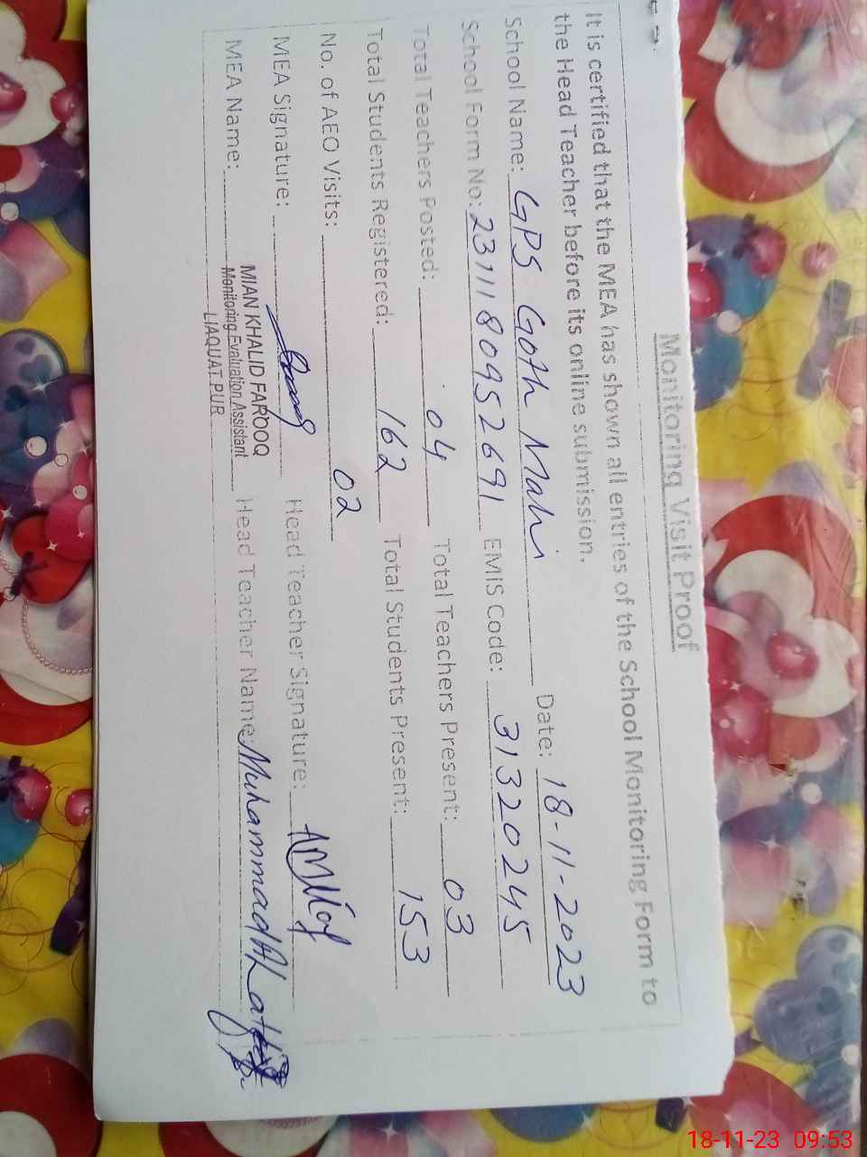 | EMIS Code: 31320245 | Name of School: GPS GOTH MAHI | |||
