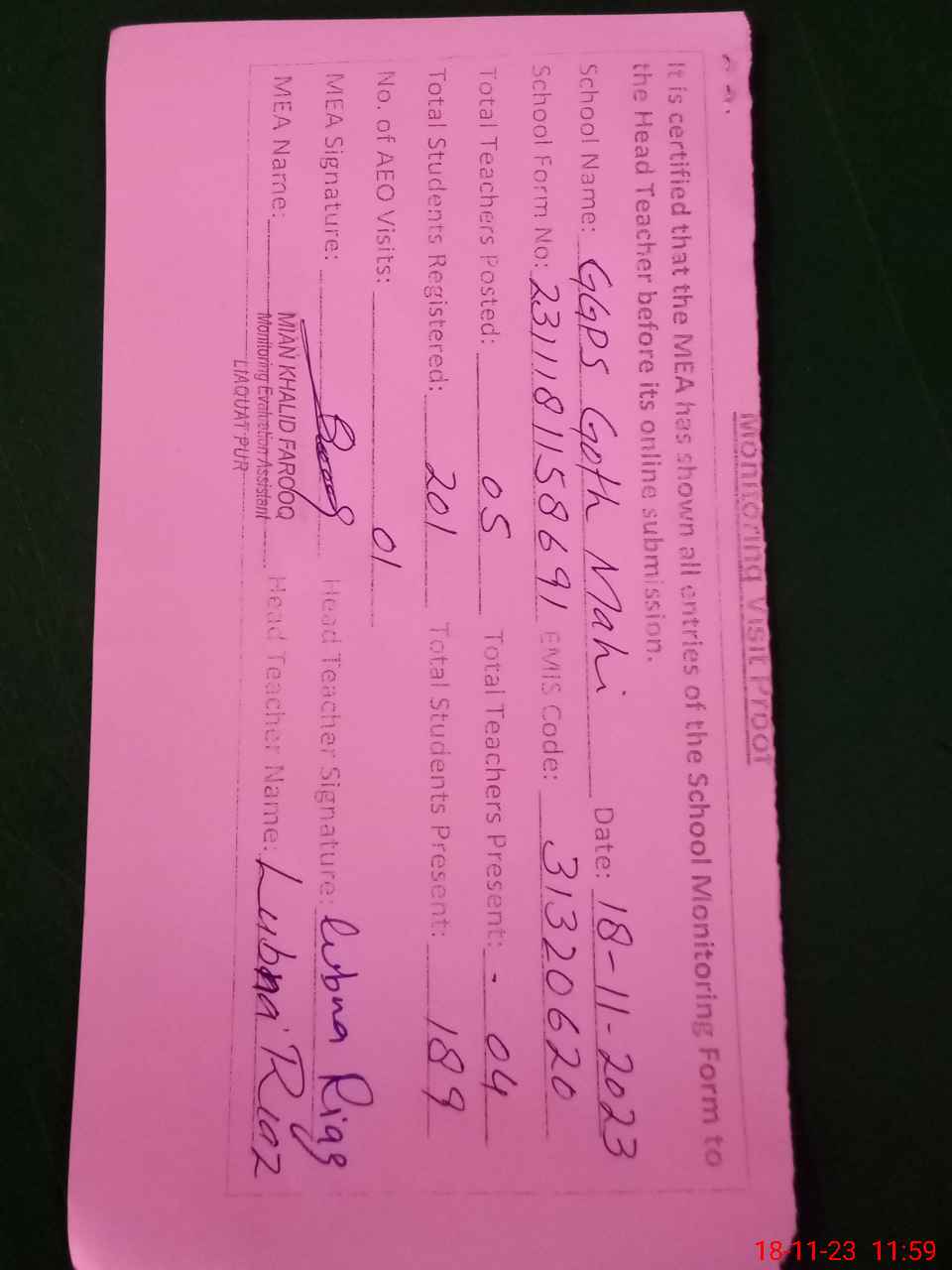 | Attendance Register | Head Teacher | MEA with School | Visit Proof |