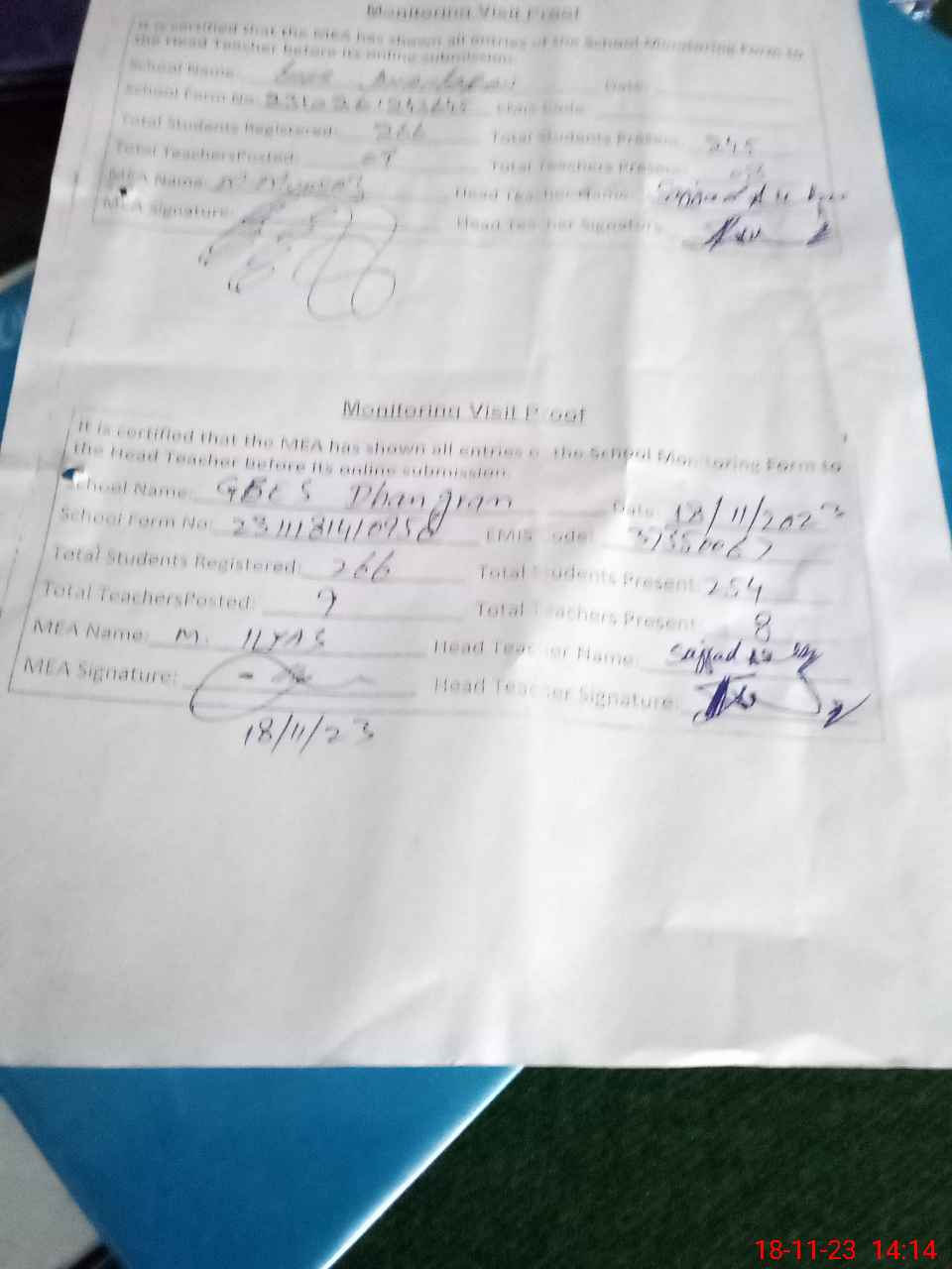 | Attendance Register | Head Teacher | MEA with School | Visit Proof |