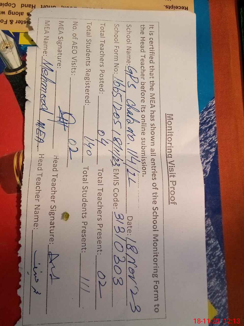 | Attendance Register | Head Teacher | MEA with School | Visit Proof |