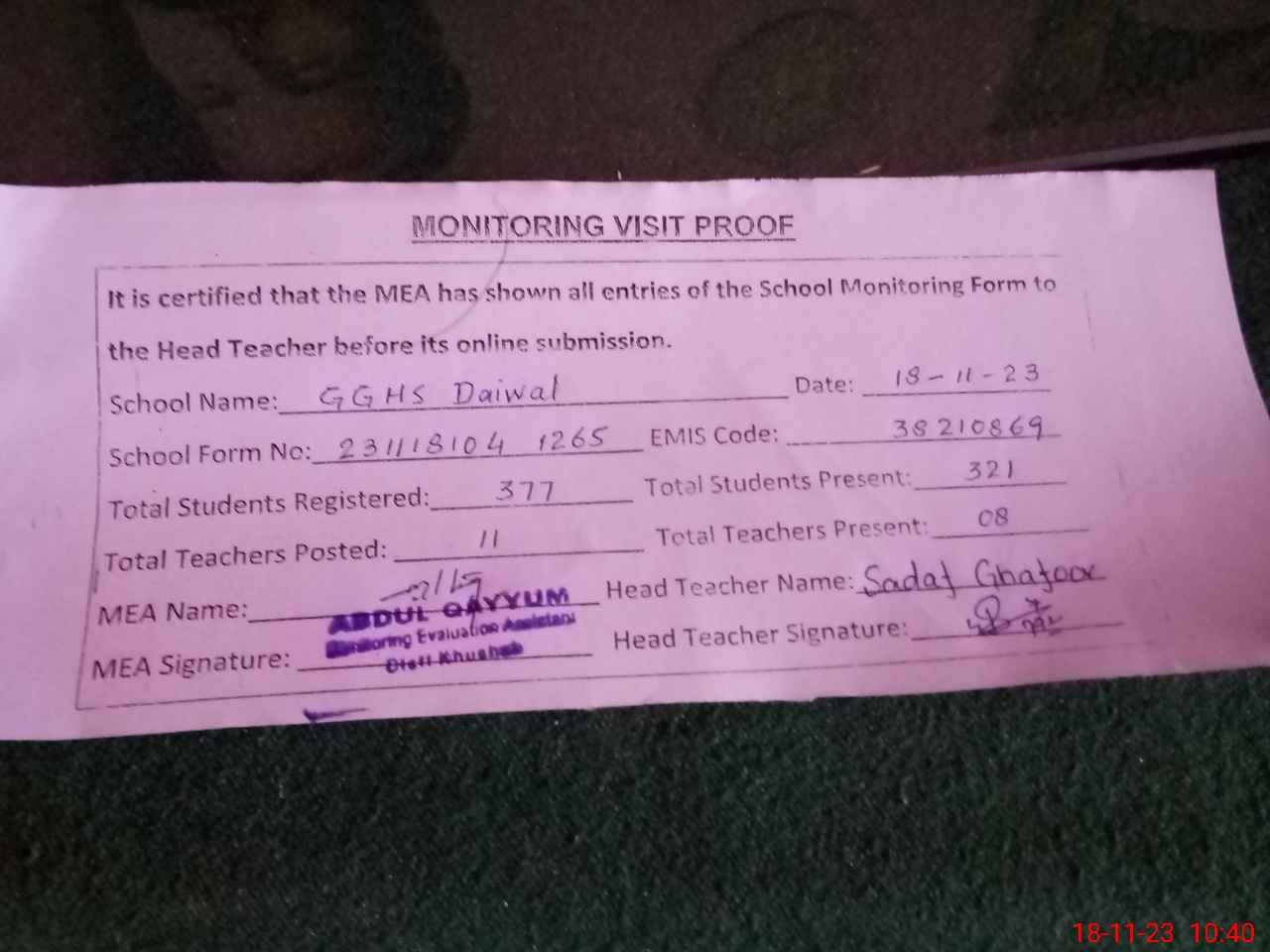 | Attendance Register | Head Teacher | MEA with School | Visit Proof |
