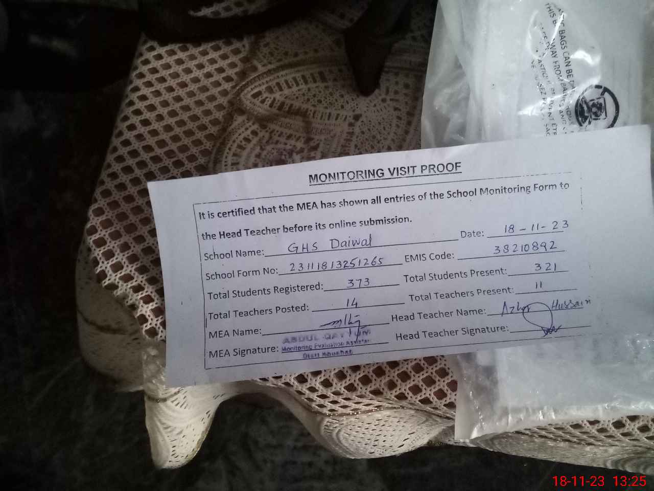 | EMIS Code: 38210892 | Name of School: GHS DAIWAL | |||