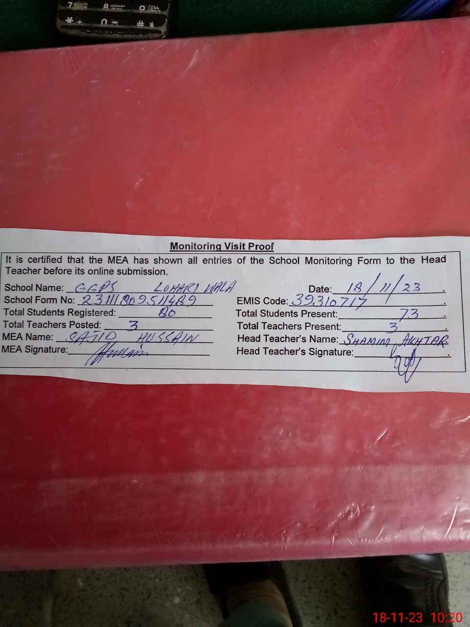 | Attendance Register | Head Teacher | MEA with School | Visit Proof |
