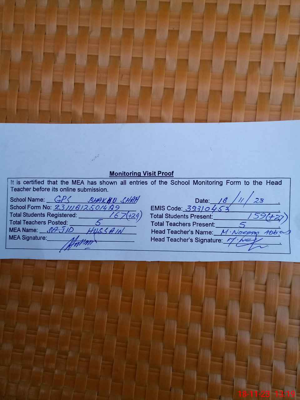 | Attendance Register | Head Teacher | MEA with School | Visit Proof |