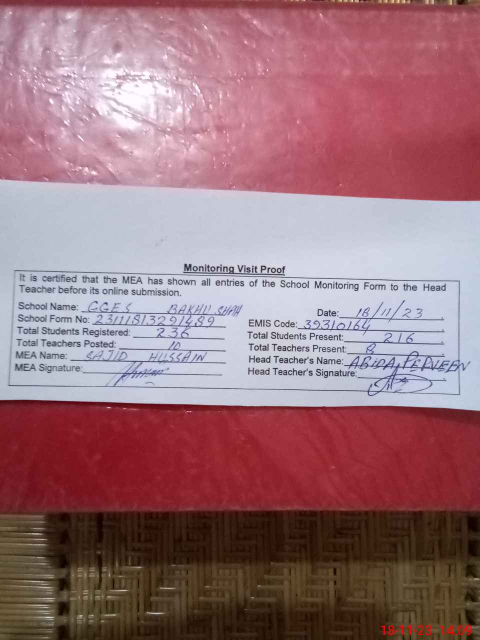 | Attendance Register | Head Teacher | MEA with School | Visit Proof |