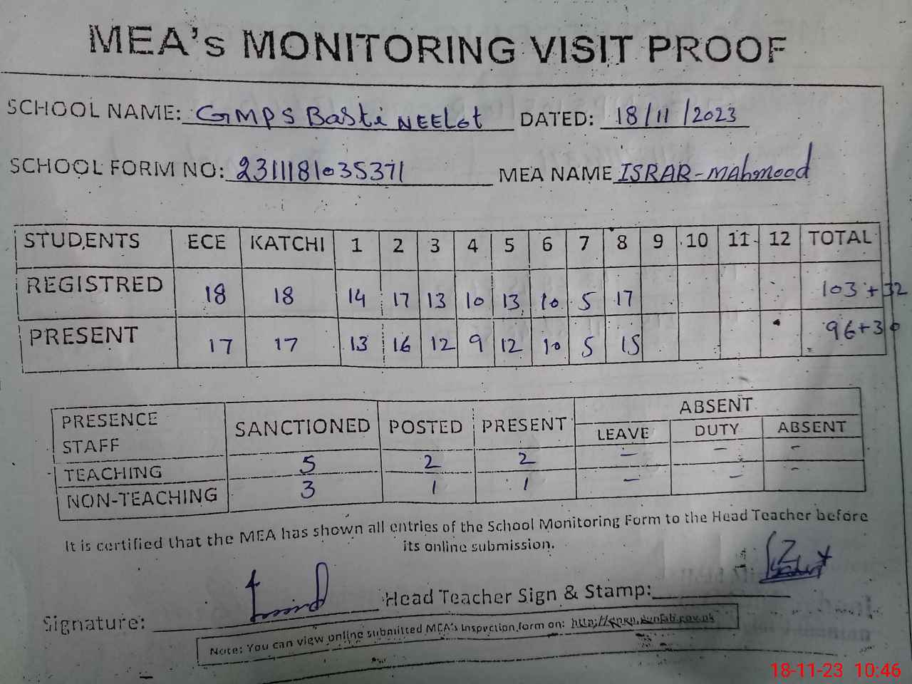 | Attendance Register | Head Teacher | MEA with School | Visit Proof |