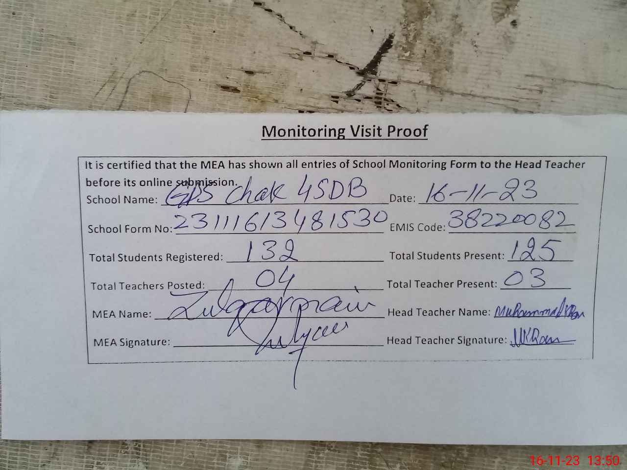 | EMIS Code: 38220082 | Name of School: GPS CHAK NO. 45/DB | |||