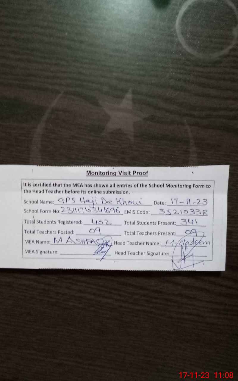 | Attendance Register | Head Teacher | MEA with School | Visit Proof |