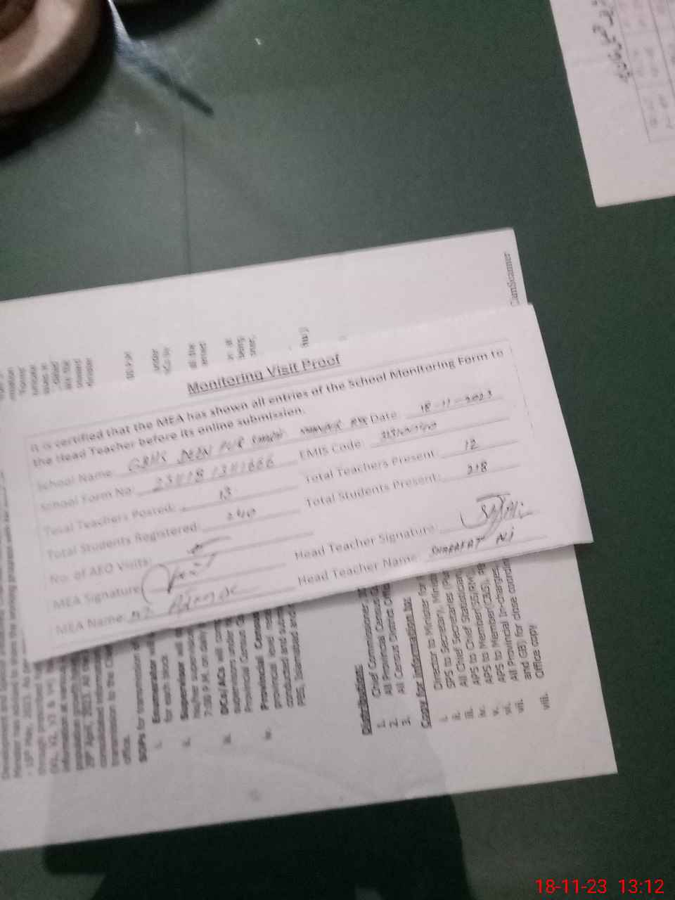 | Attendance Register | Head Teacher | MEA with School | Visit Proof |
