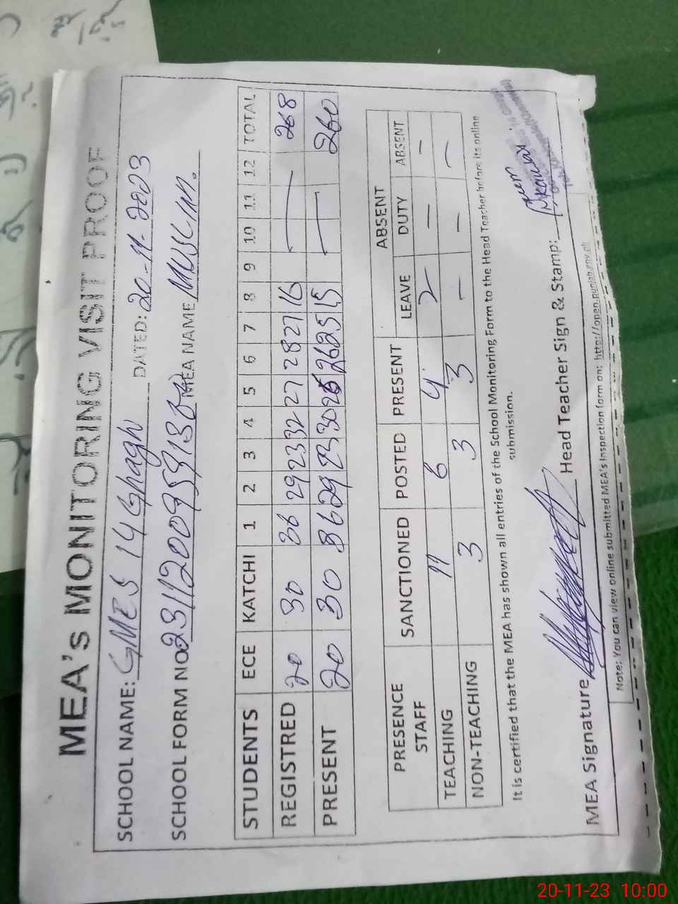 | Attendance Register | Head Teacher | MEA with School | Visit Proof |