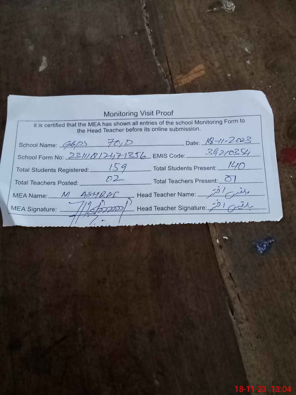 | Attendance Register | Head Teacher | MEA with School | Visit Proof |