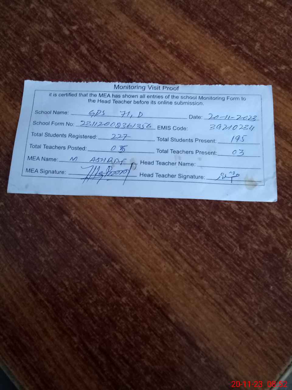 | Attendance Register | Head Teacher | MEA with School | Visit Proof |