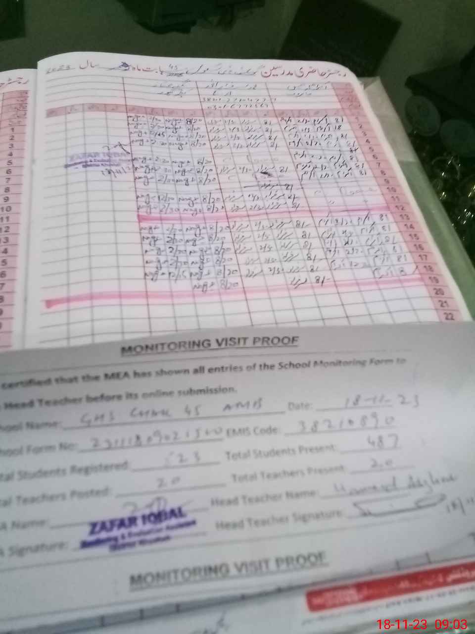 | Attendance Register | Head Teacher | MEA with School | Visit Proof |