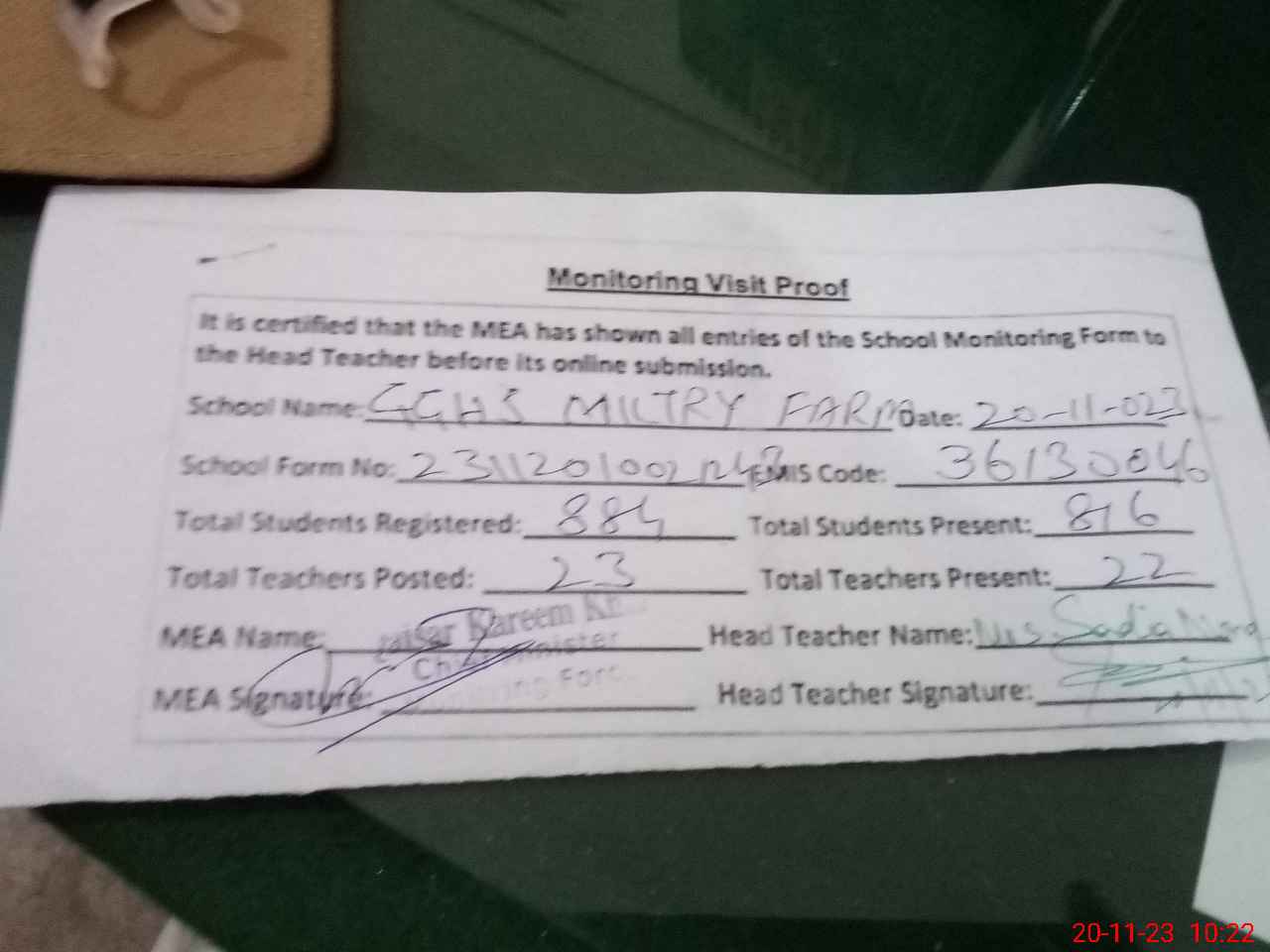 | Attendance Register | Head Teacher | MEA with School | Visit Proof |