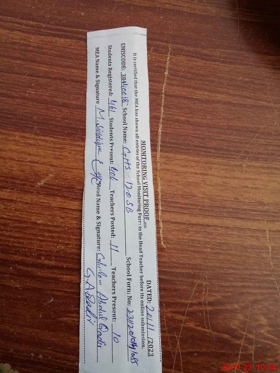 | Attendance Register | Head Teacher | MEA with School | Visit Proof |