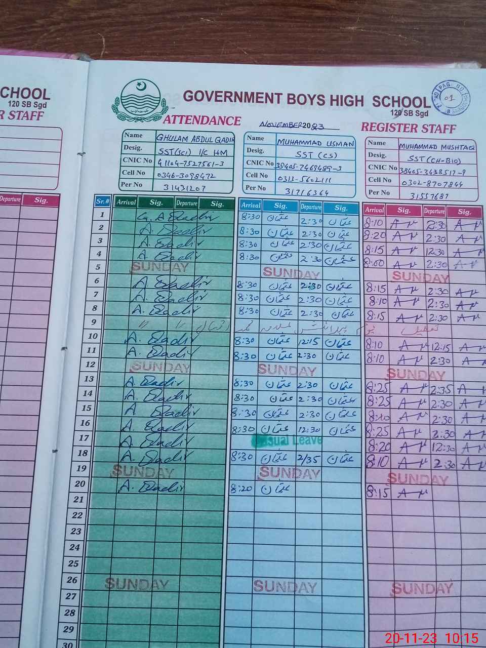| CNIC | Full Name | Designation | R/C | Absence during last cal. month |