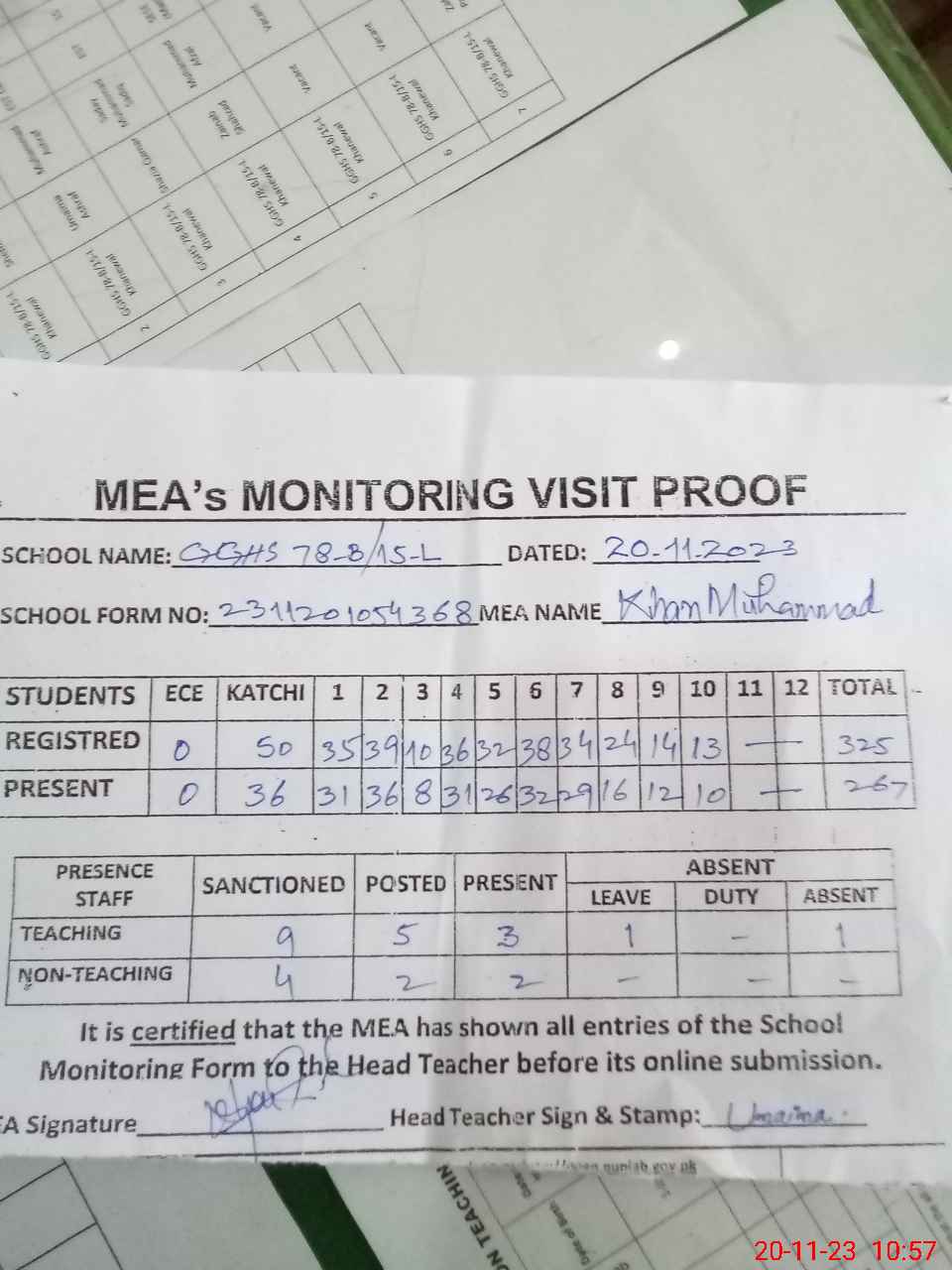 | Attendance Register | Head Teacher | MEA with School | Visit Proof |