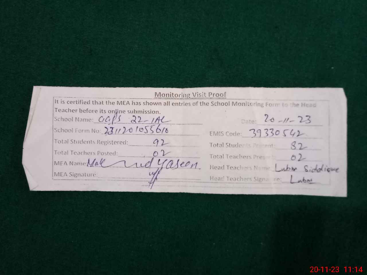 | Attendance Register | Head Teacher | MEA with School | Visit Proof |