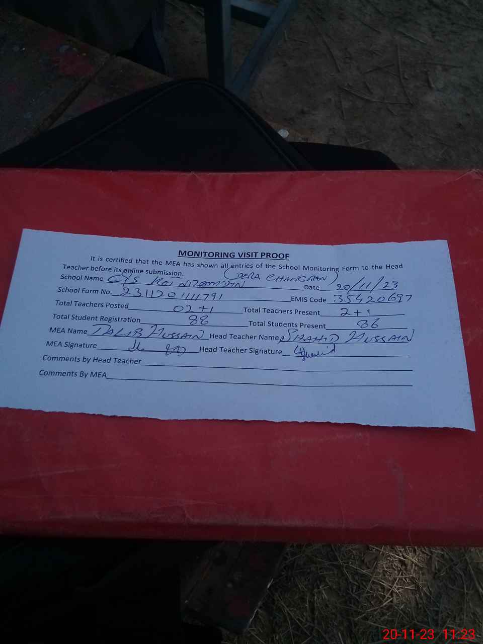 | Attendance Register | Head Teacher | MEA with School | Visit Proof |