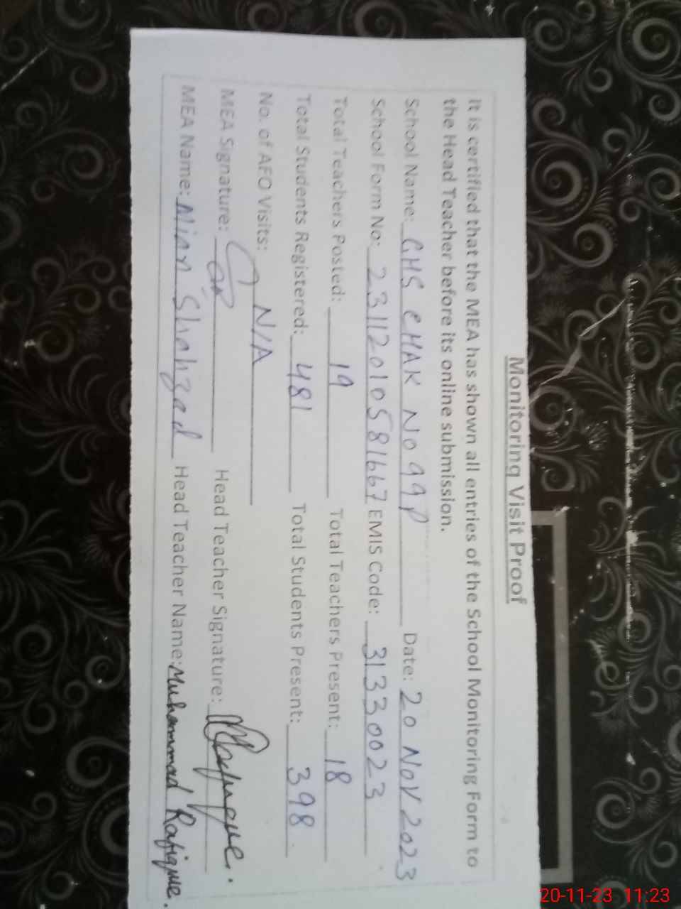 | Attendance Register | Head Teacher | MEA with School | Visit Proof |