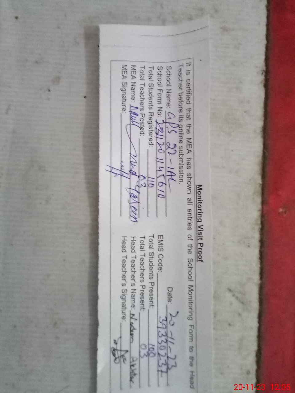 | Attendance Register | Head Teacher | MEA with School | Visit Proof |