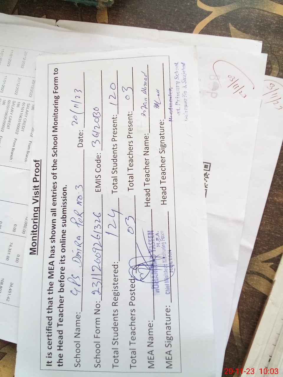 | EMIS Code: 36120130 | Name of School: GPS DAIRA PUR NO. 3 SHUJA ABAD | |||