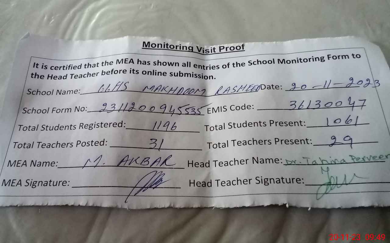 | EMIS Code: 36130047 | Name of School: GGHS MAKHDOOM RASHEED MULTAN | |||