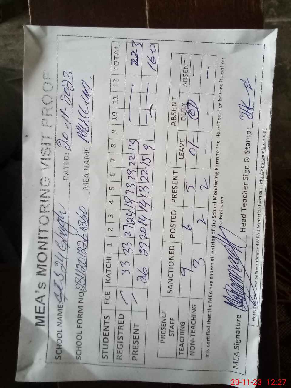| Attendance Register | Head Teacher | MEA with School | Visit Proof |