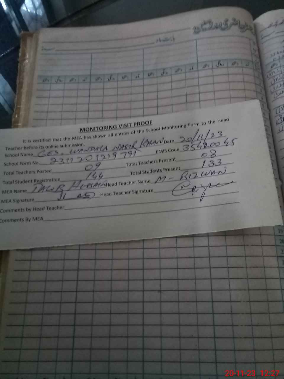 | Attendance Register | Head Teacher | MEA with School | Visit Proof |