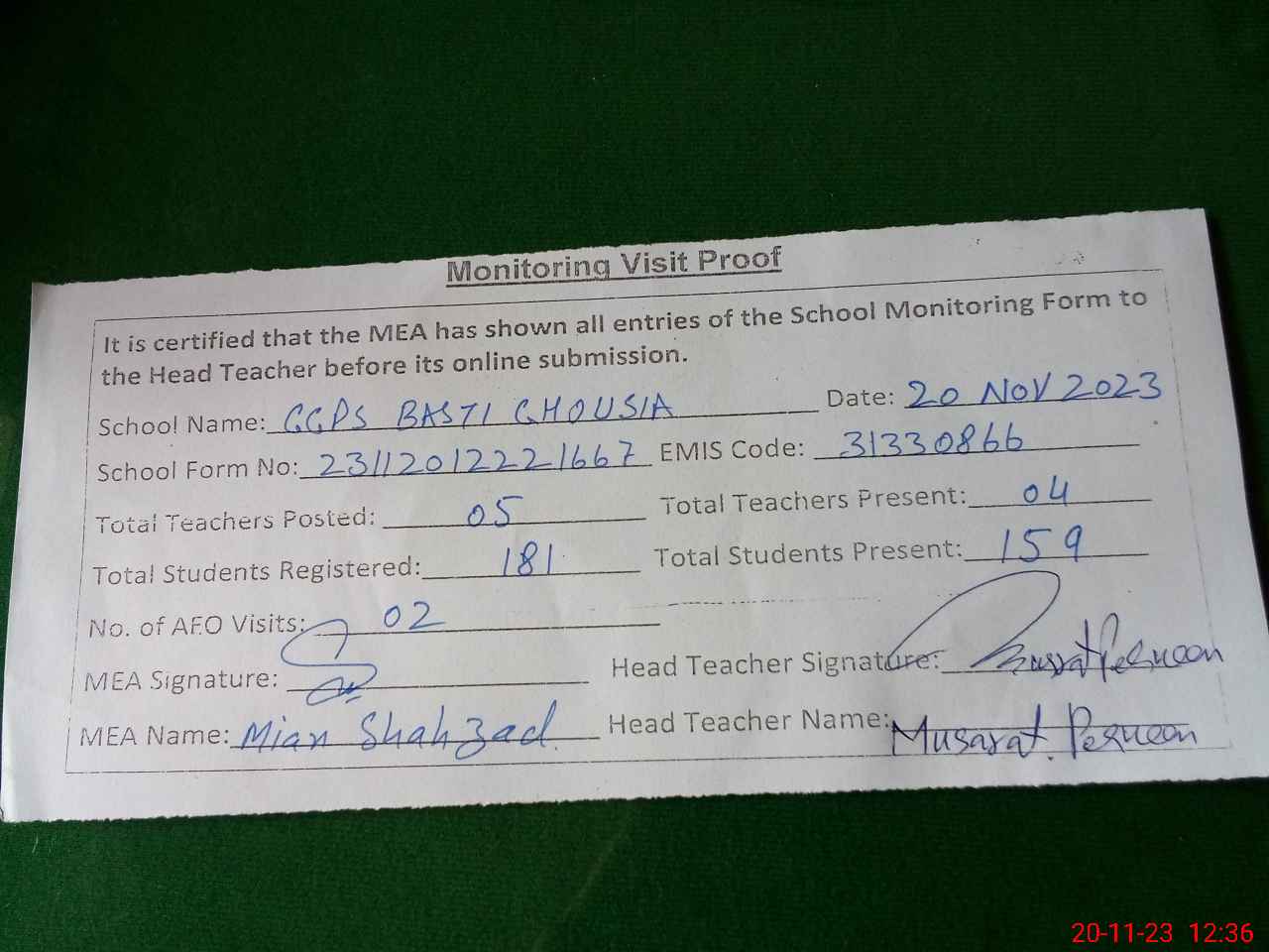 | Attendance Register | Head Teacher | MEA with School | Visit Proof |